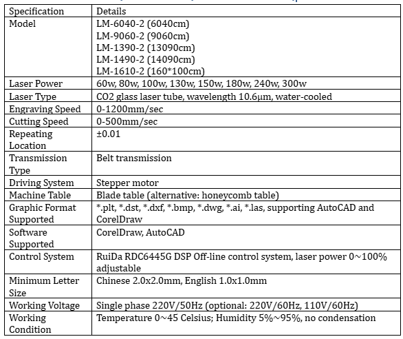 CO2 laser tube: Machine uses the China top brand Yongli or Reci CO2 laser tube with 80W, 100W, 130W, 150W, 180W, 240W, 300W laser power